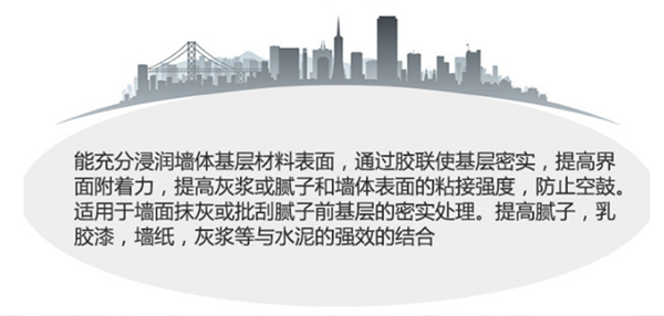 能充分浸潤墻體基層材料表面,通過膠聯(lián)使基層密實,提高膩子,乳膠漆,墻紙,灰漿等與水泥的強效結合