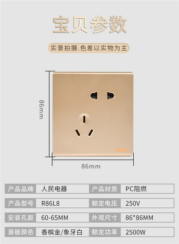 人民開關插座典雅香檳金白色單雙控開關